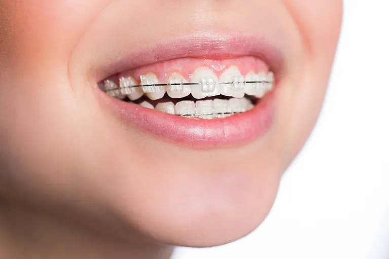 セラミック製ブラケット・・・自然な白色で歯に馴染むように作られています。プラスチック製ブラケットよりも目立ちにくく、より着色もしにくいです。セラミックはとても硬く丈夫なので摩耗しにくいです。