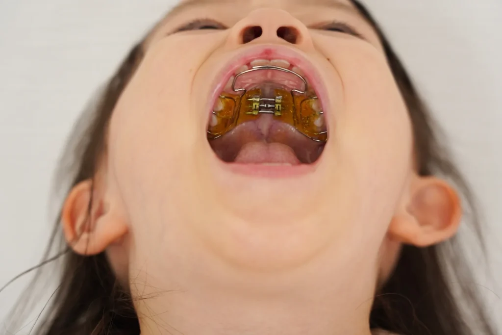 入れ歯のようなプレート状の装置です。装置についたネジを段階的に回していくことで、歯列の幅を広げて永久歯の生えるスペースを増やす方法です。